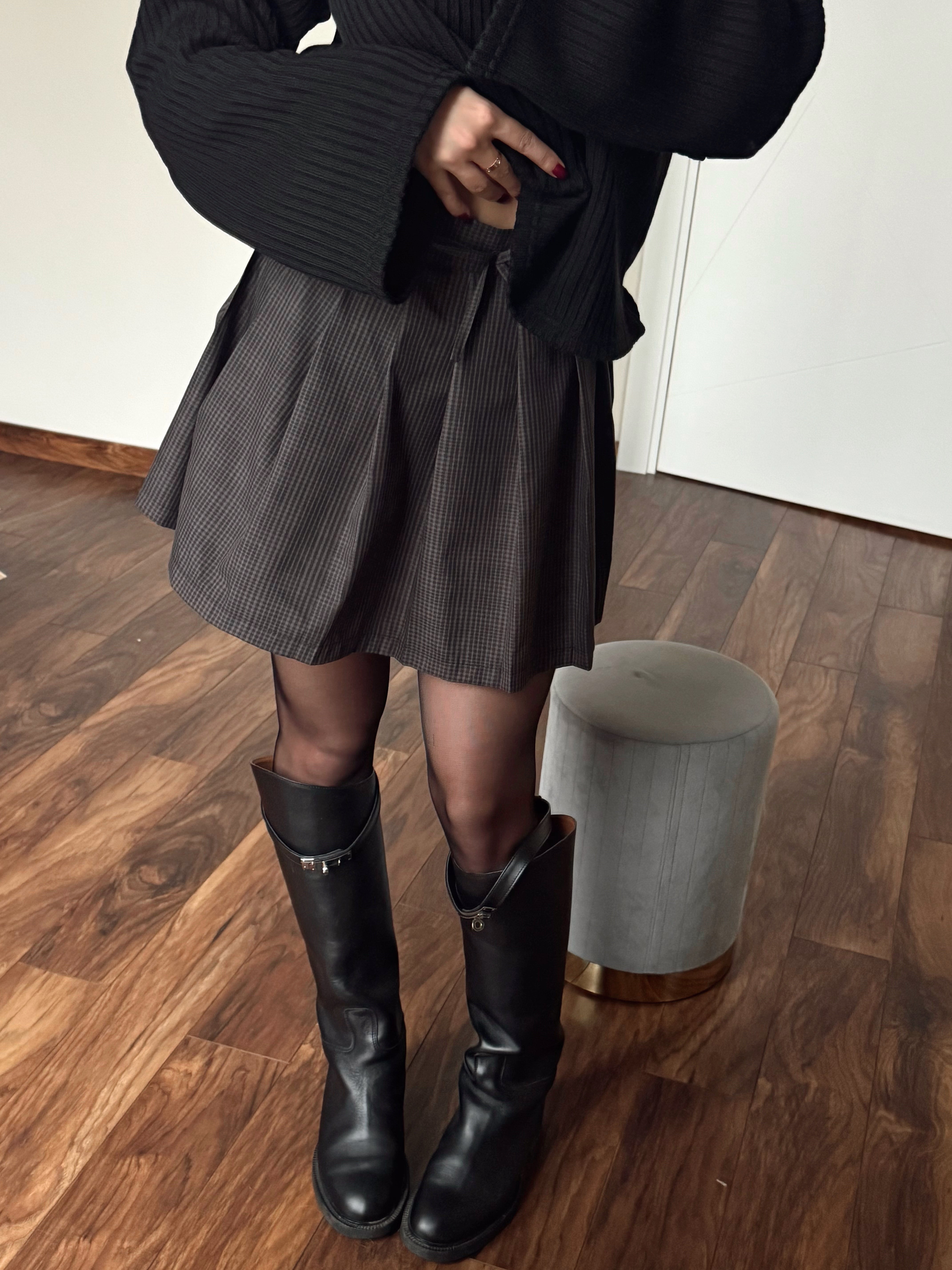 The Polli pleated skirt in gray-brown check is the perfect choice for a stylish and refined look.